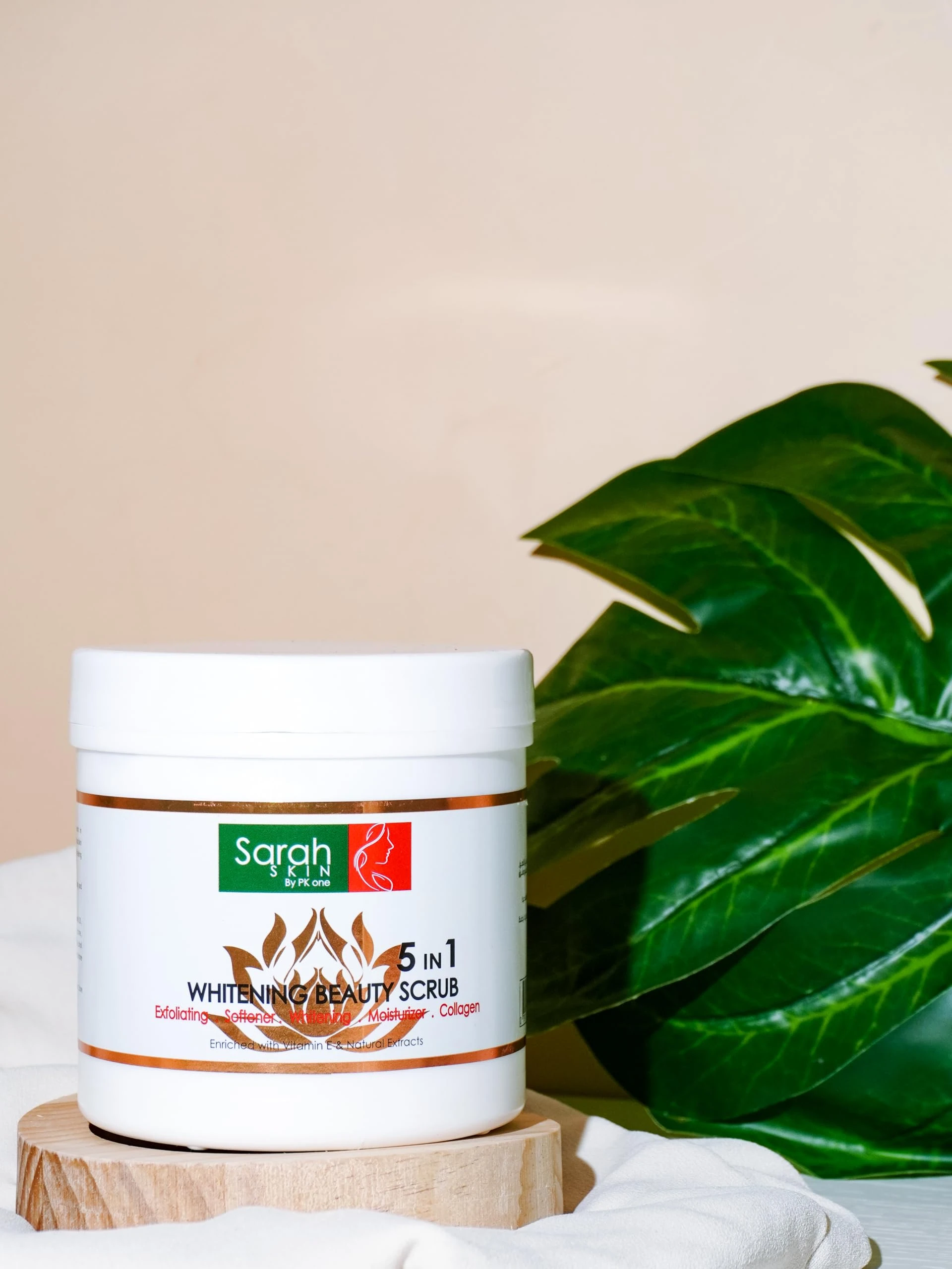Sarah Skin 5-in-1 Whitening Beauty Scrub is a multi-benefit exfoliating formula designed to cleanse, brighten, and rejuvenate the skin. This gentle scrub helps remove dead skin cells, unclog pores, and improve skin texture, leaving your skin smoother, clearer, and more radiant.